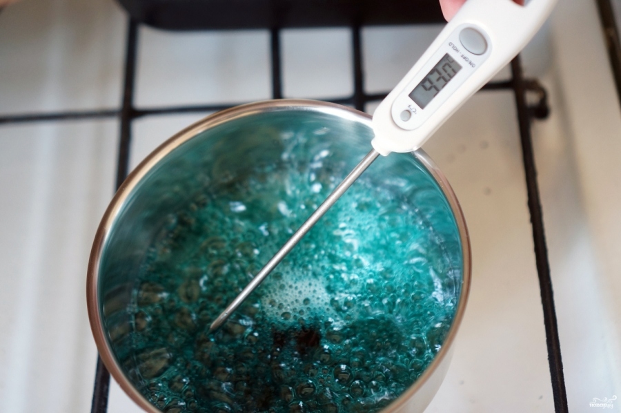 - Змішайте воду з 250 г. цукру. Нагрійте такий сироп до 120 градусів.