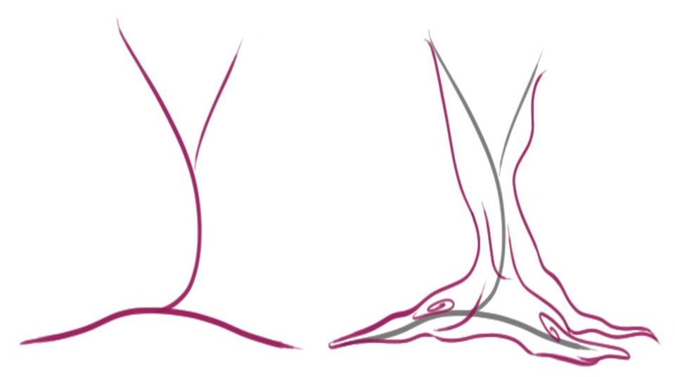 - додайте товщини стовбура біля основи, домалюйте кривизну коренів нал землею і нерівності кори для реалістичності,