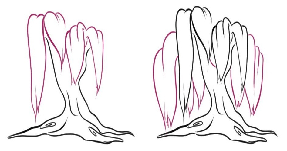 - намалюйте 2 лінії, що йдуть в різні боки з однієї точки. Це буде стовбур і напрямок розгалуження крони верби,