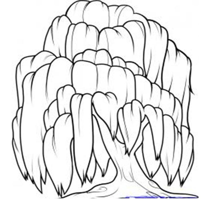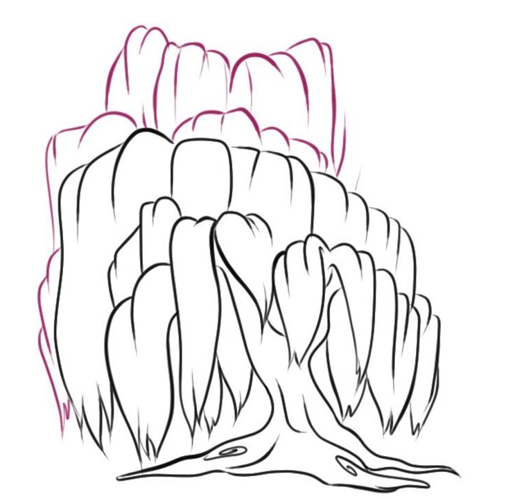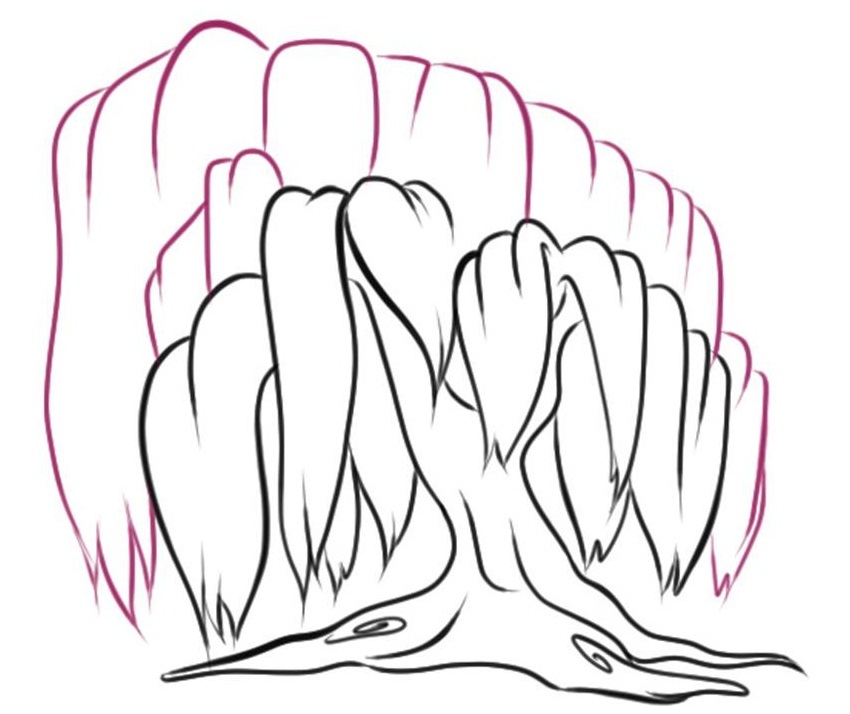 - над кожним розгалуженням ствола зверху вниз додайте спадають пасма гілок. Вони будуть схожі на густі пасма волосся,