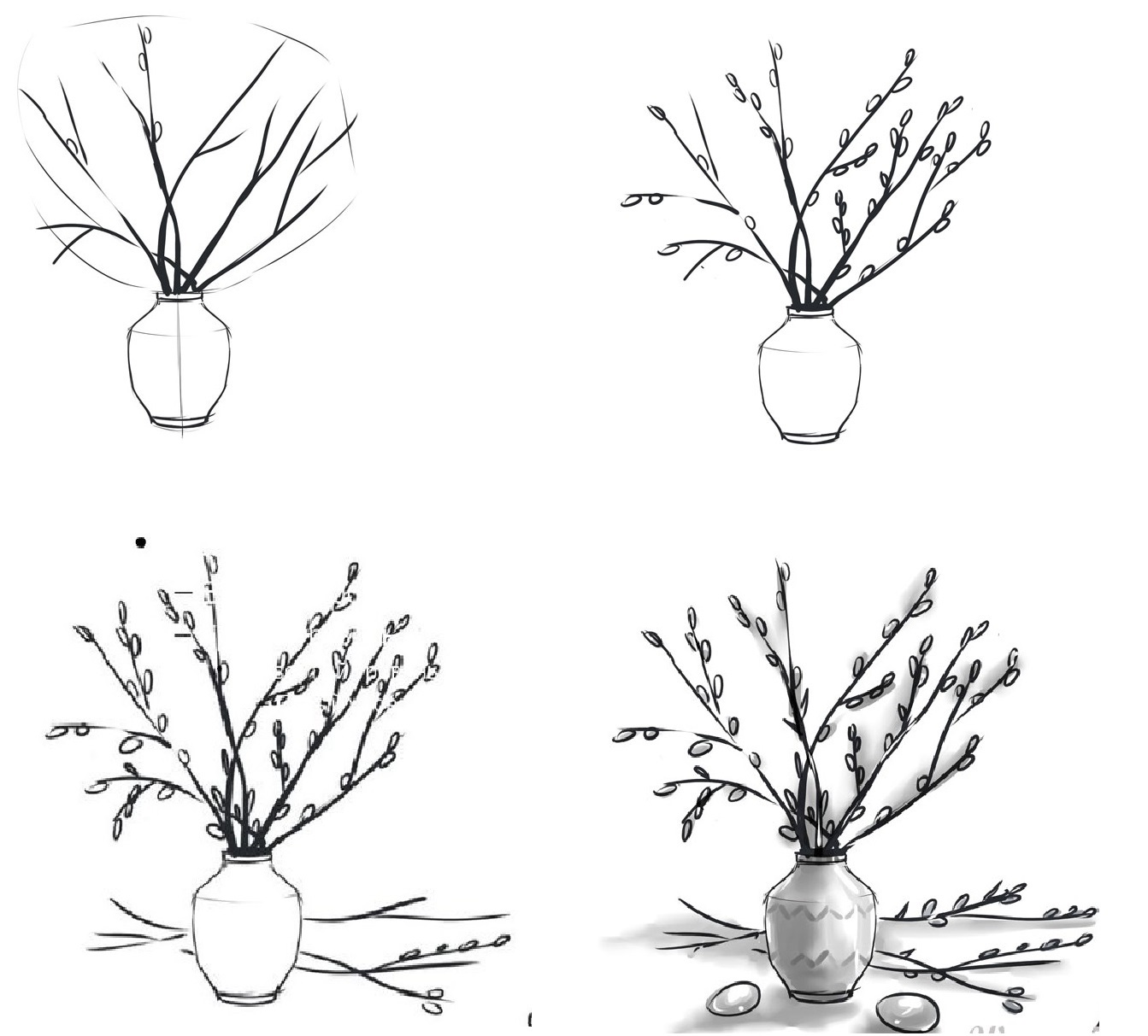 Додаємо гілки верби в непрозору вазу. Скористайтеся порадами попереднього розділу за промальовуванні гілок верби або: