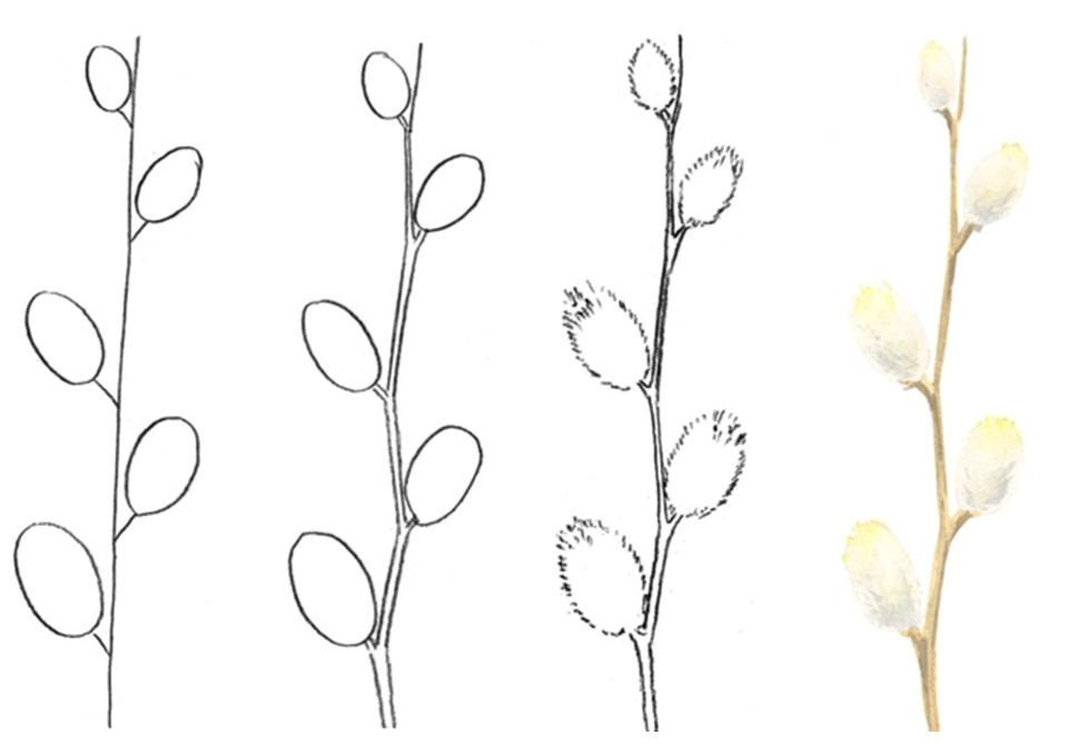 Як намалювати гілку верби олівцем та гуашшю поетапно?