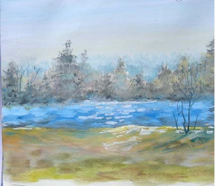 - аркуш паперу, розділіть на 4 кольорові частини — коричнева горизонтальна смуга внизу, над нею коричнево-зелена трава, далі — смуга для крон дерев і кущів з чорного, коричневого, зеленого і сірого тонів, і найвища — блакитна з білим і жовтим. Вони передадуть відтінок весняного неба,