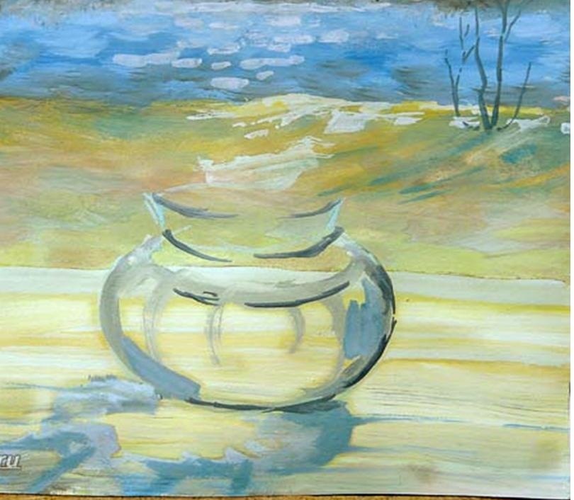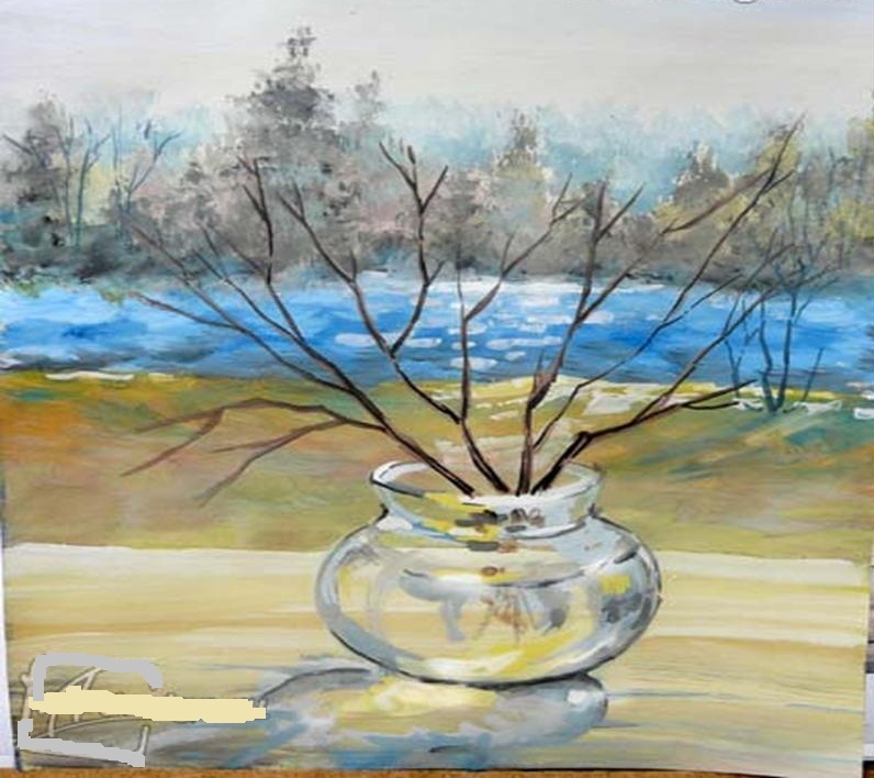 - на тлі столу олівцем накидайте контур вази. Вона буде з водою, тому додавайте розбавлених мазків з білою фарбою,