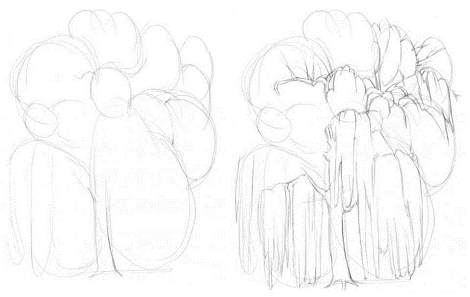 - злегка позначте масивний стовбур і кілька овалів різного розміру навколо нього і вгору,
