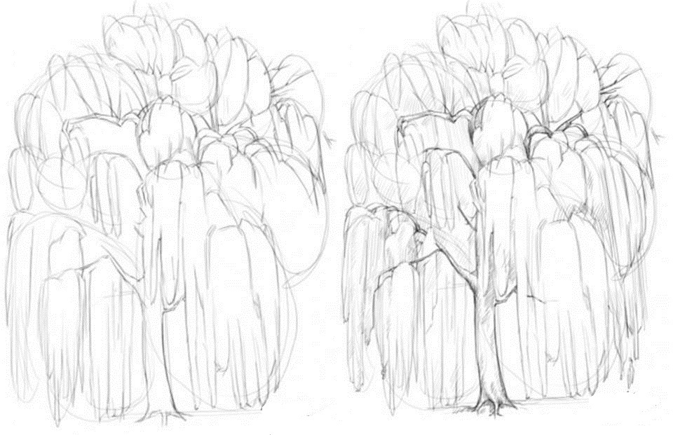 Щоб створити малюнок дерева верби гуашшю, підготуйте ескіз олівцем так: