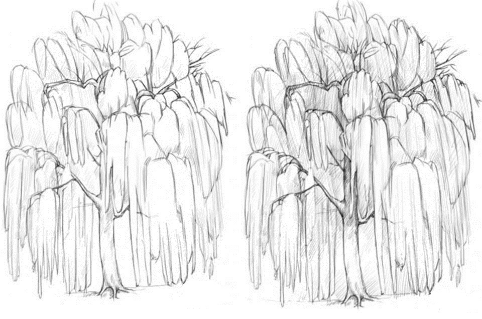 - заштрихуйте гілки знизу і праворуч товщі, позначивши тінь,