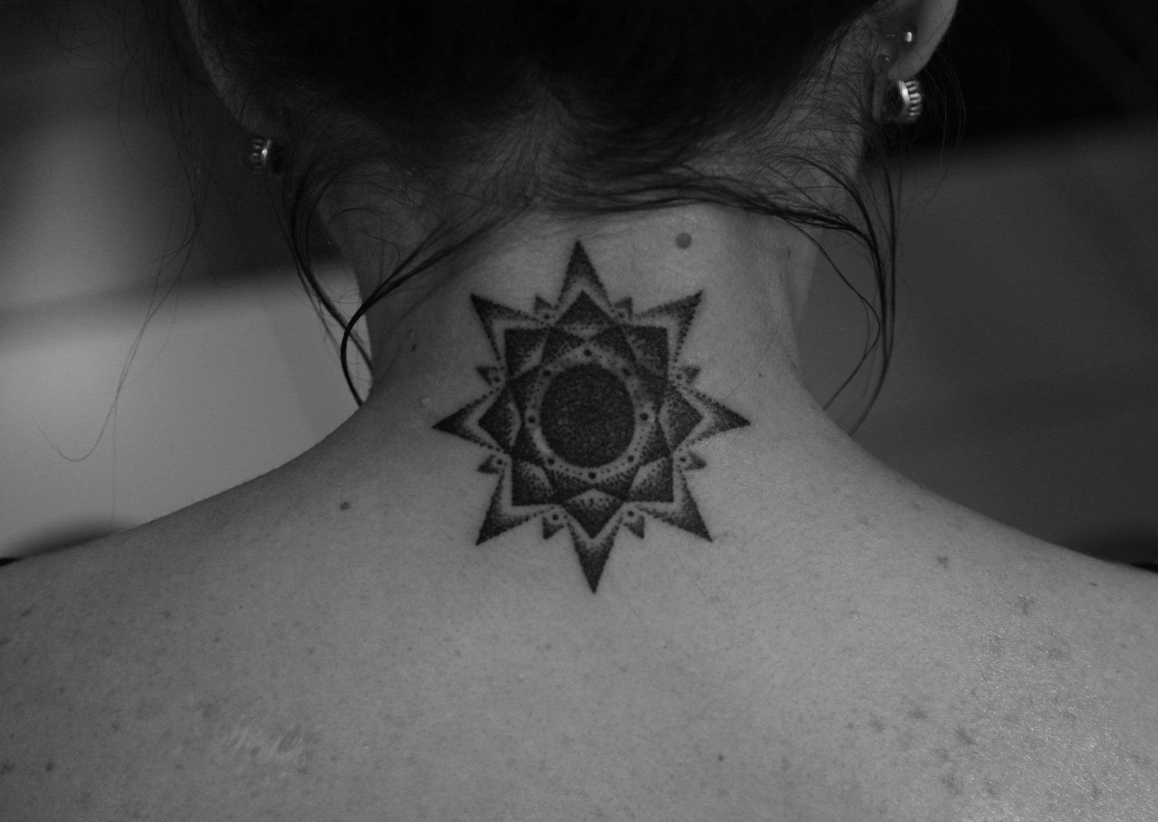 Дуже красиво і ефектно виглядає тату мандала на шиї, але не скрізь, а саме на задній потиличної частини. Там вона прихована від загального огляду або прикрита волоссям. Вона пов’язує ваша свідомість з потойбічними реальностями і духовним світом.