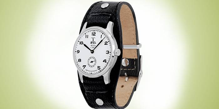 - характеристики: чорні, запас ходу 40 ч., всі стрілки центральні, корпус з нержавіючої сталі з матовим шліфуванням і поліруванням, мінеральне скло, циферблат з римськими цифрами і лакованою поверхнею, прозора задня кришка, шкіряний ремінець;