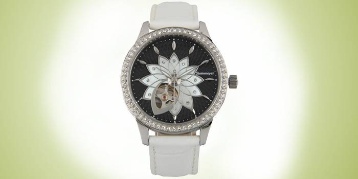 - характеристики: з автоподзаводом, секундна стрілка зміщена, римські цифри, джерело енергії – пружинний механізм, є підсвітка, водонепроникність 30 м, круглі, корпус з неіржавіючої сталі, шкіряний ремінець, виконані в білому кольорі, прикрашені стразами, відображають число;