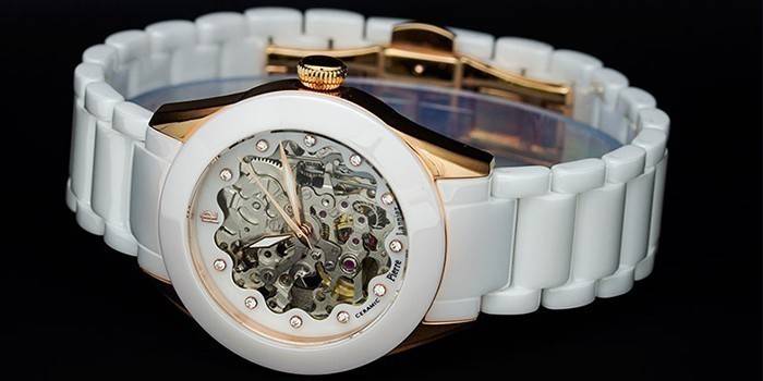 - характеристики: скелетон, жіночі, механічні з автопідзаводом, корпус з нержавіючої сталі з PVD покриттям, водозахист WR 30, білий циферблат, відображення часу аналогове, цифр немає, керамічний браслет, скло мінеральне, корпус цілий, підсвічуються стрілки, декоровані кристалами;