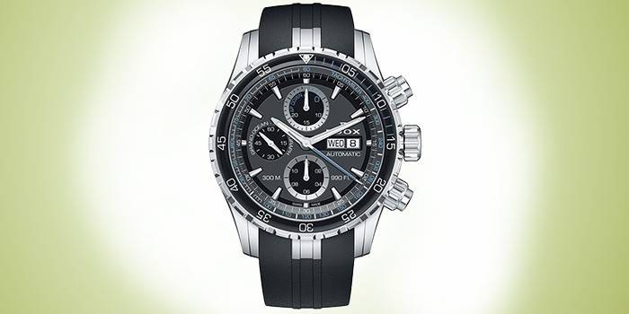 - характеристики: чоловічі, механічні з автопідзаводом, корпус із сталі з керамічними вставками, циферблат чорний, каучуковий браслет, рівень водозахисту 300 WR, стрілки і мітки люмінесцентні, сапфірове скло, показ числа і дня тижня, заводна головка загвинчується м подвійною прокладкою, задня кришка прозора;