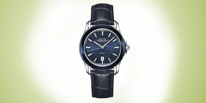 - характеристики: чоловічі, механічні з автопідзаводом, корпус сталевий з керамічними вставками, шкіряний ремінець і циферблат синього кольору, водозахист 100 WR, сапфірове скло з покриттям антивідблиску, показують число, протиударне пристрій осі балансу, прозора задня кришка на 6 гвинтах;