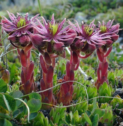 - Російське молодило росте в лісостеповій зоні, також має зелене листя і насичений, яскравий квітка і довгий квітконіс.