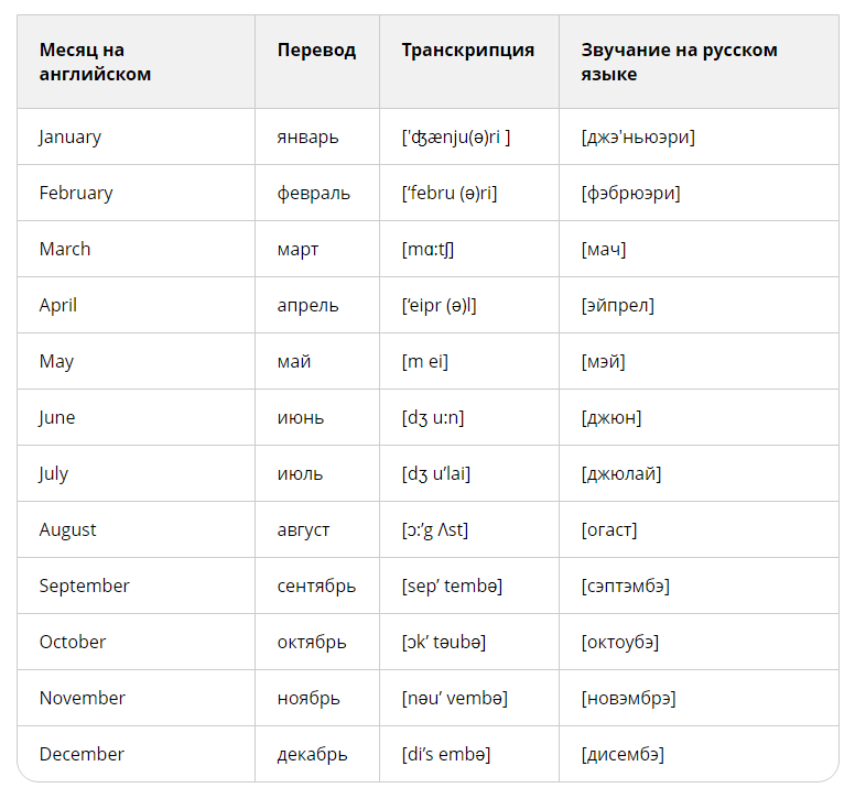 Назва місяців англійською з транскрипцією та перекладом: опис