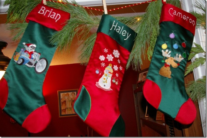Вишиті блискітками новорічні шкарпетки на каміні