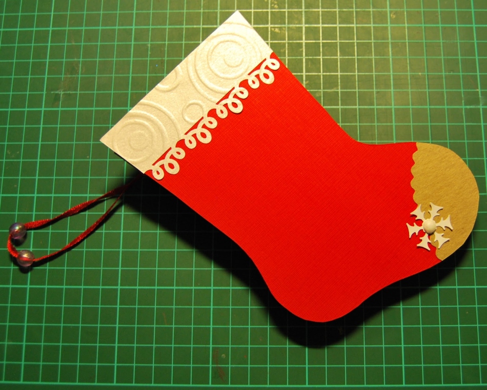 Робити новорічні шкарпетки можна з кольорового паперу або картону. Так само ви можете використовувати звичайну альбомну папір, яку в подальшому легко розфарбувати фарбами, прикрасити блискітками, золотим піском, бантиками зі стрічок. Зроблені паперові вироби нанизуються на нитку і ланцюжок з шкарпеток вішається в обрану частину будинку.