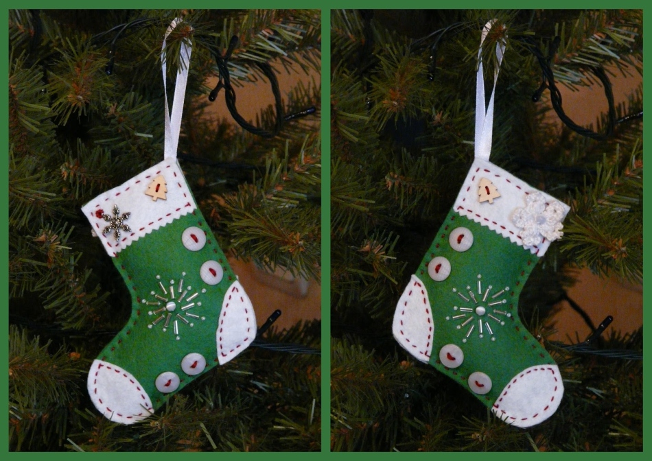 Прикрашайте шкарпетки з фетру золотом і сріблом, робіть на ньому вишивку нитками і блискітками. З допомогою викрійок зробіть аплікацію у вигляді символів Різдва, а так само Нового року: Дід Мороз (Санта Клаус), сніжинки, сніговики, санки, рукавиці, ялинкові кульки, коробки подарунків, льодяники, олені і багато іншого.