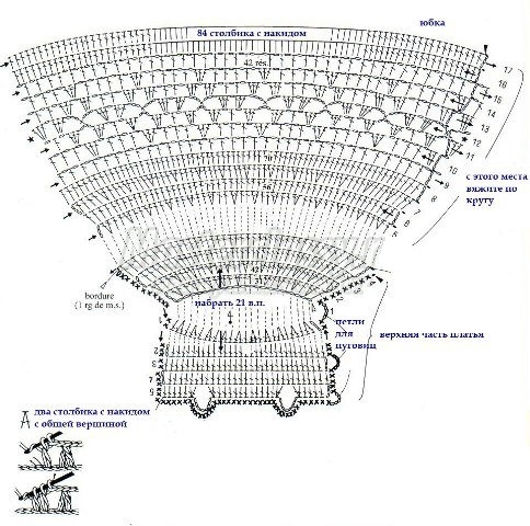 В’язання починається з першої схеми, набираємо 51 повітряних петель, розгортаємо в’язання і пров’язуємо за схемою 6 стовпчиків з накидом, робимо реглан, вив’язуючи 3 стовпчика з накидом з 1 петлі і т. д. за схемою. Після того як закінчите першу схему (вывяжите ліф сукні) переходите до другої схемою (нижній) і вывязываете спідницю вже круговим в’язанням.