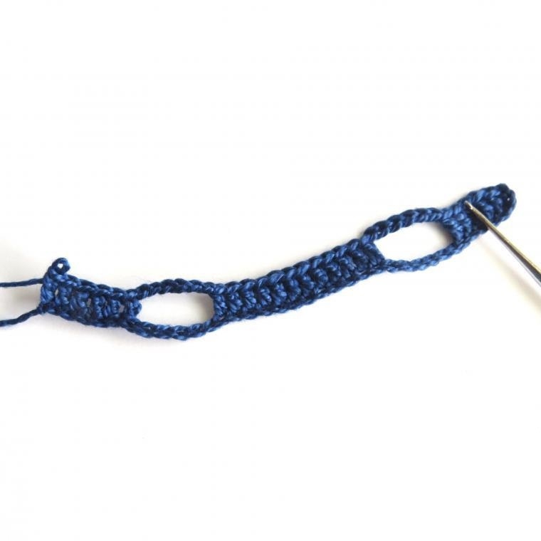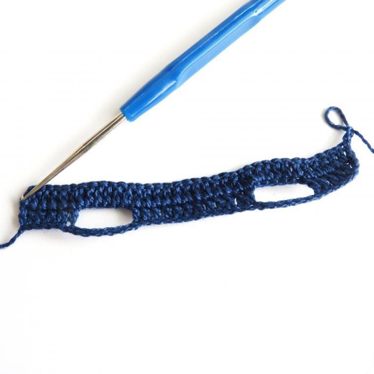 - Починаємо в’язати одяг для ляльок гачком, в даному випадку сукню. Набираємо 51 повітряну петлю і розгортаємо в’язання, з другої повітряної починаємо вив’язувати 8 стовпчиків з накидом (ССН), 9 стовпчиків без накиду (СБН), 16 ССН, 9 СБН, 8 ССН.