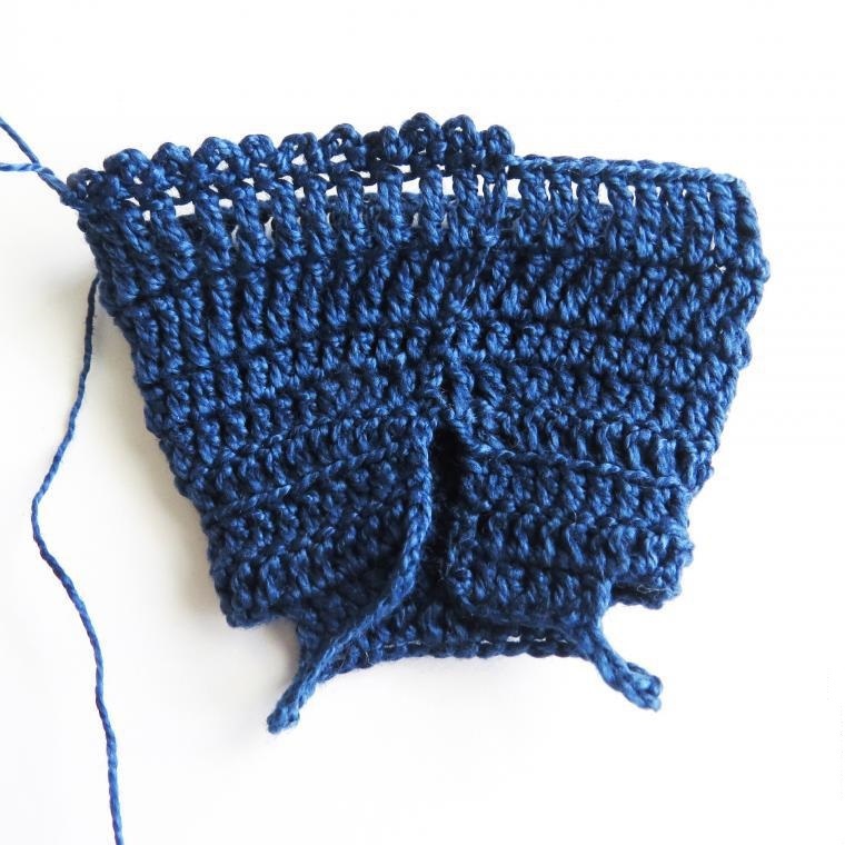 - Продовжуємо в’язати з такими ж добавками, поки не досягаємо самої широкої точки стегон. Після цього петельки вив’язувати не потрібно, і дві сторони залишаються з рівною кромкою.