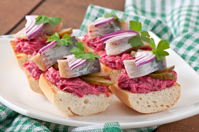 - Нанесіть цукрову суміш на підсмажений батон і викладіть на неї зверху шматочок оселедця