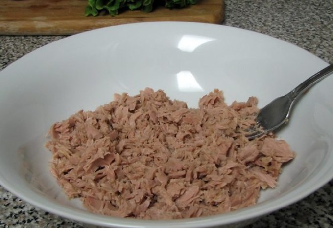 - Відкрийте банку з тунцем, викладіть його в миску і допомогою виделки або блендера перетріть в однорідну масу.