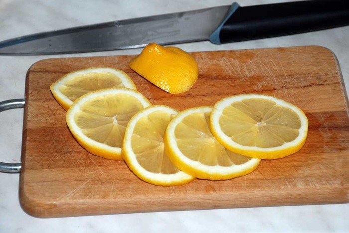 - Лимон обшпарте окропом, швидко охолодіть і наріжте часточками.
