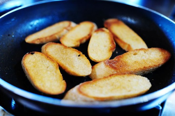 - Багет нарізати акуратними скибочками і підсушіть на сухій сковороді або в тостері.