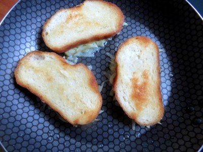 - Батон нарізаємо тонкими скибочками і обсмажуємо на рослинному маслі (можна з однієї сторони)