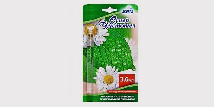 - «Суперчистотел» – суміш лугів, пропалюють тканина бородавки. Шкіру поруч з нею обробляють дитячим кремом, на освіту 5 днів наносять по краплі ліки. Поступово бородавка зникне.