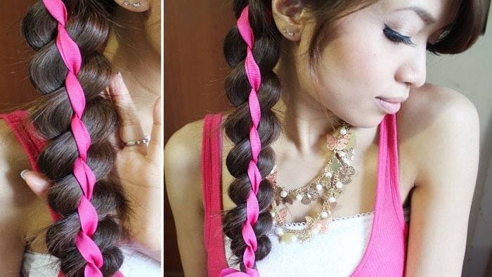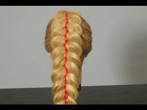 Така зачіска, якої ми вас навчимо – це коса з п’яти пасом з вплетеною стрічкою. Виглядає укладання дуже цікаво, ефектно. Найбільша коса виходить широкою, що зараз дуже модно. Обов’язково додайте в свою скарбничку навички плетіння такою яскравою, незвичайною коси. Адже це готовий варіант для свята або іншого особливого приводу. Її можна заплітати також набік, або зробити дві коси з боків. Відео нижче – навчання створення цієї цікавої, гарної зачіски з стрічкою. Уважно стежте за рухами пальців, і ви без зусиль повторіть плетіння собі самостійно.
