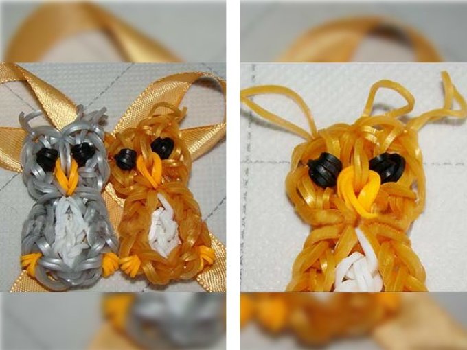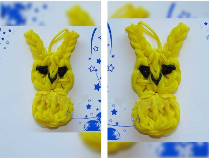 Це ще один цікавий вихованець, який створюється легко і його можна використовувати як брелок. Якщо чітко слідувати інструкції, то у вас вийде гарна фігурка зайчика і її буде не соромно навіть подарувати кому-небудь. Для виконання вам потрібно взяти жовті і чорні гумки.