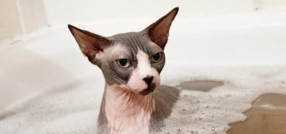 - Він бесшерстный. Котів безшерстих порід в обов’язковому порядку купають раз в тиждень. До речі, багато сфінкси і подібні їм кішки люблять плавати.