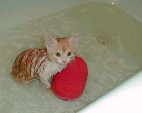- Тварина акуратно опускають у воду, намочують його шерсть губкою, дуже акуратно. Ніколи не занурюють кішку у воду з головою.