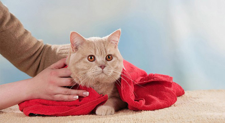 - Як і кошеня, сушать і зігрівають кішку рушником. Змінюють його, коли він намокне. Тварина з довгою шерстю доцільно сушити феном з теплим повітрям.
