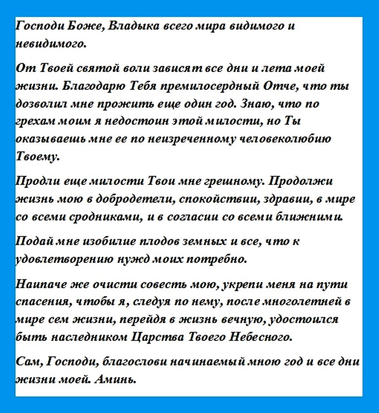 Православну молитву, призначену читати тільки в Дні народження, треба вимовляти саме в той відрізок часу, коли ви з’явилися на світ, але якщо ви не знаєте, коли саме стався цей факт, значить, потрібно прочитати молитву з ранку, коли прокинетеся.