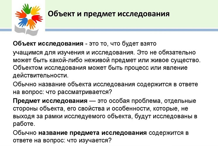 Ніяка дослідницька робота не в змозі охопити весь об’єкт для вивчення, вона спрямована тільки на конкретний предмет дослідження. Тому чітке розмежування цих понять – запорука успішної дослідницької роботи.
