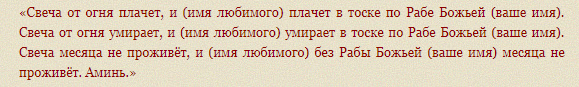 Дайте погоріти свічці трохи і потушкуйте. До речі, ритуал не повинен проводитися в неділю або церковне свято. Поки свічка не догорить до кінця, щодня вимовляєте змова. Зазвичай проходить близько місяця, поки все завершиться. Залишки воску потрібно закопати в безлюдному місці.