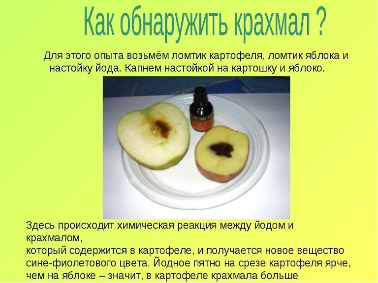 • Врахуйте, що невелика зміна кольору просто вкаже на низький вміст крохмалю. Наприклад, якщо ви візьмете яблуко, то пляма не буде синього кольору, але придбає злегка коричневий колорит або трохи брудний колір жовтогарячого тони. Важливо ще знати, що крохмаль в яблуках зменшується в процесі росту. Можете навіть провести досліди, взявши спіле і зелене яблуко – кольори будуть різні.