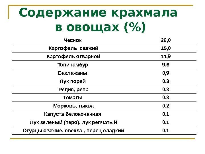 ВАЖЛИВО: Фрукти, зелень і овочі не можна назвати 100% безкрахмалистыми, оскільки його мала частка все ж є. Але цей відсоток не доходить і до однієї сотої. Єдине, в моркві це відсоток трохи вище за інших – до 0,2%.