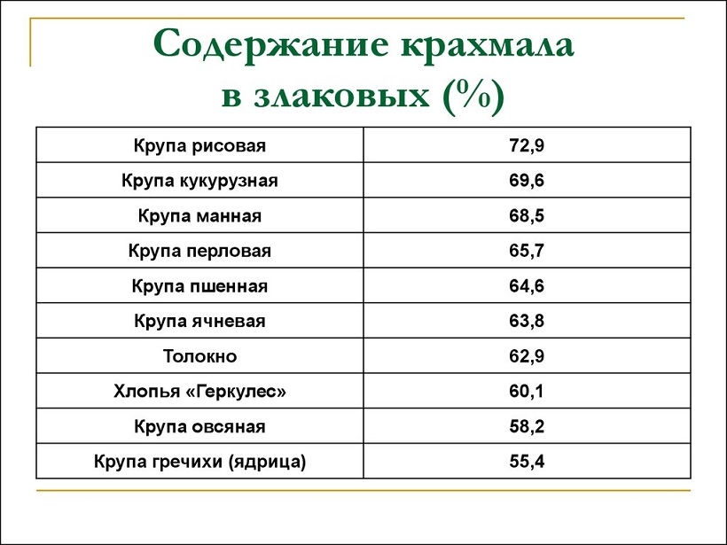 • Всі каші мають високий вміст крохмалю, також приблизно 60%.