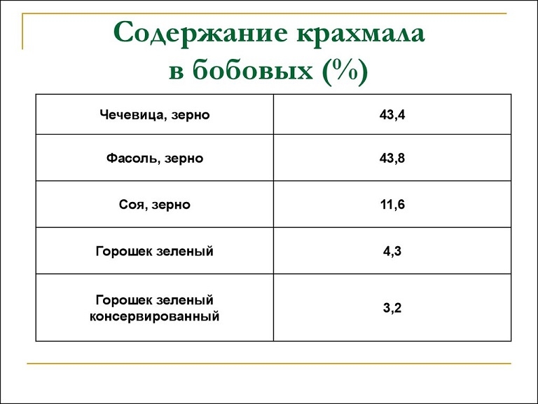 • Квасоля також відноситься до сімейства Бобові, але відсоток вмісту крохмалю трохи менше – 38%.