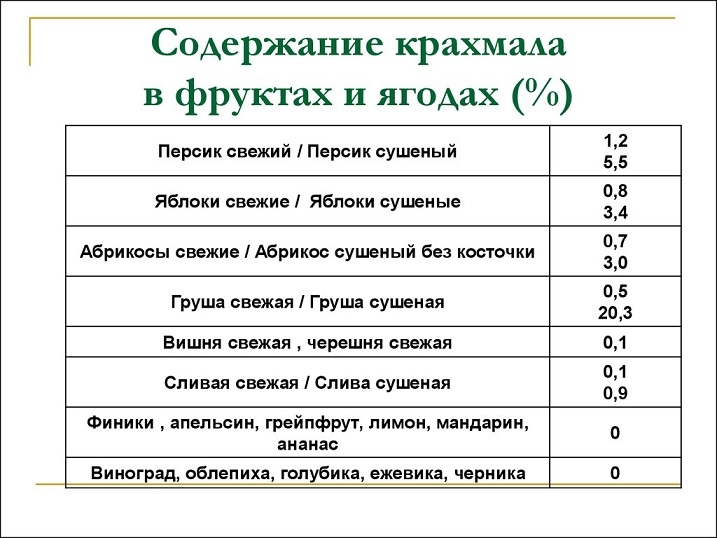 Варто сказати ще кілька слів про фруктах. Практично всі вони (крім вищеописаних продуктів) не мають крохмалю. Наприклад, діткам призначають до дворічного віку робити акцент на чорносливі і фініках. Вони легко засвоюються, перетравлюються і дають достатній заряд енергії.