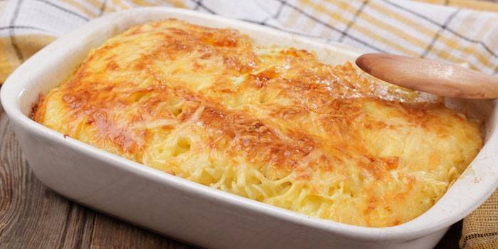 2. Деко змастити вершковим маслом, викласти картопляний шар, запекти третину години при 180 градусах.
