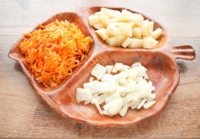 - Режим на дрібні шматочки картоплю, моркву, ріпчасту цибулю і пастернак