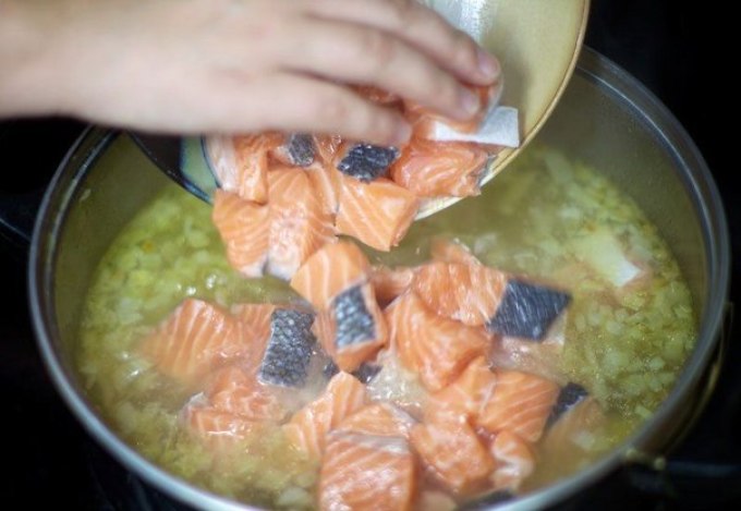 - На останньому етапі закладаємо в каструлю шматочки сьомги і даємо їй поваритися хвилин сім