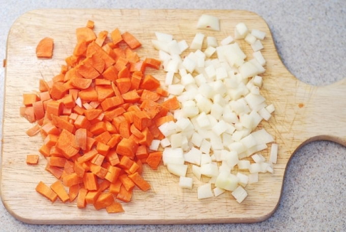 - Миємо, чистимо і подрібнюємо на дрібні кубики картоплю, моркву і ріпчасту цибулю