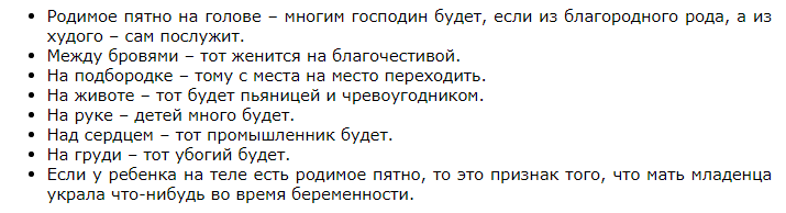 • Темні родимки було прийнято вважати поганим знаком, вони могли обіцяти і щастя, якщо розташовувалися на обличчі і кистях рук