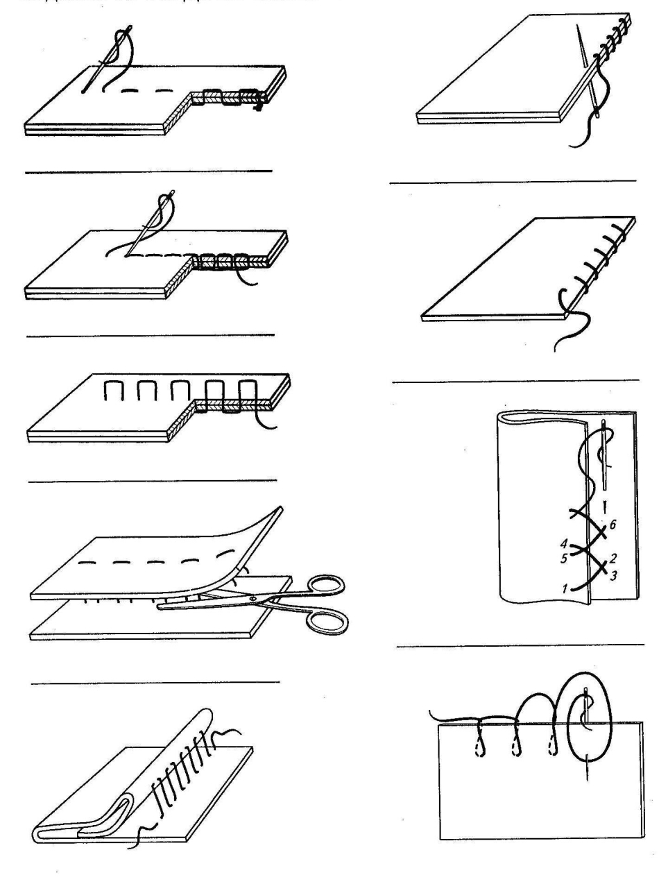 Крім того, якщо тканина має розсипчасту структуру, то для її обробки ще треба використовувати і стібки у вигляді хрестиків, петель (косі шви) і т. п. Так, наприклад, обробку петель на речі слід робити щільними маленькими стібками через край вирізів у вигляді петельних швів.